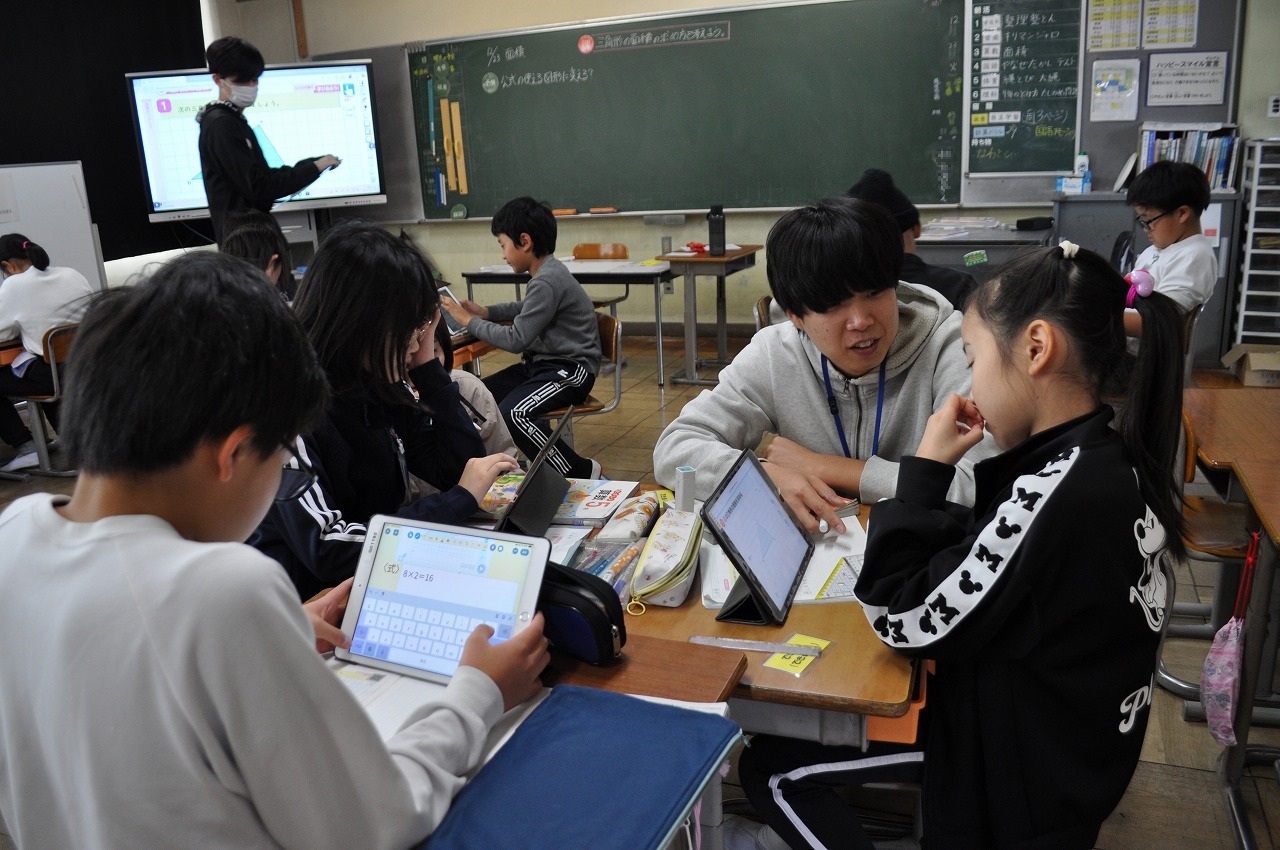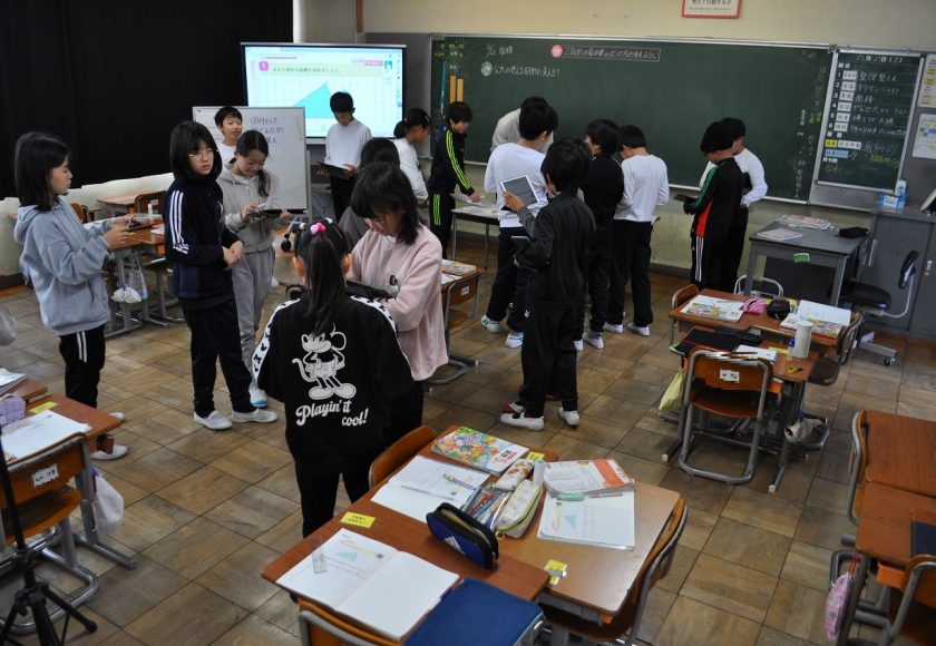 教科書のQRコードを読み取ると、問題の三角形が出てきます。任意に切り取ったり、回転させたり、移動させたりすることができます。子どもたちは、三角形を切ったり増やしたりしながら、これまで学習した長方形、正方形、平行四辺形に変形して面積を求めようとしていました。タブレット端末の操作がてきぱきとしていて驚かされました。