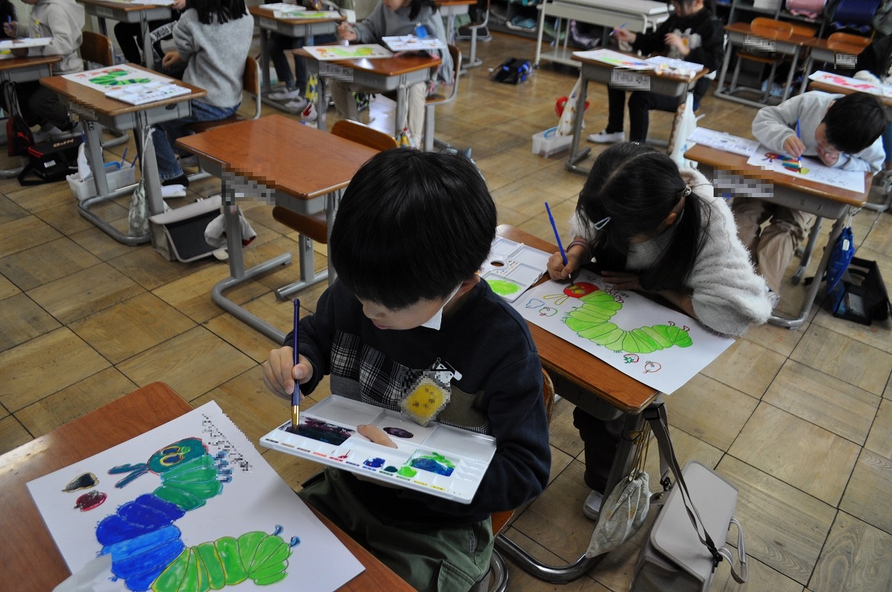 2年生が初めて絵の具を使いました。水彩絵の具やパレット、水入れの使い方を教えてもらい、早速色を塗ってみました。