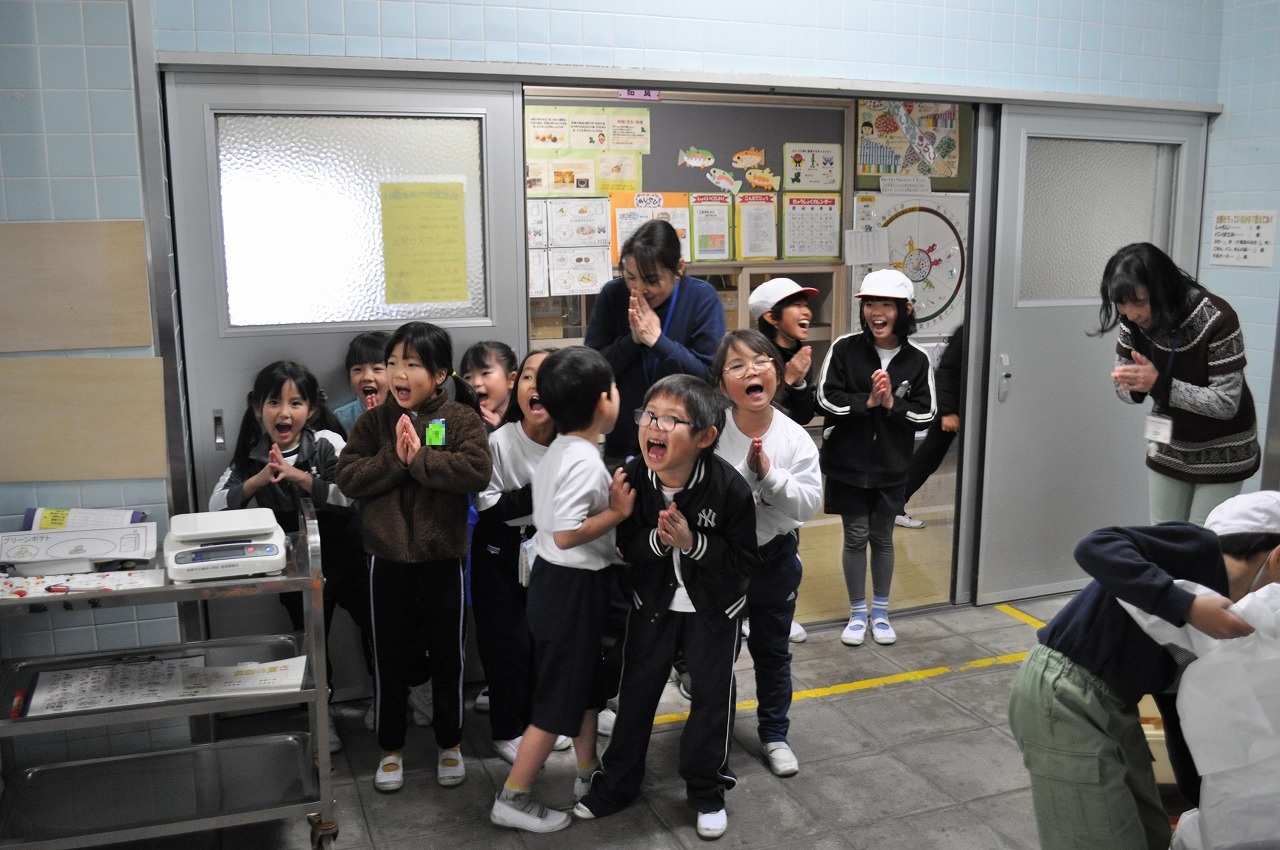 今日の給食はクリスマスメニューでした。おいしくいただくことができました。片付けにきた子たちが調理員さんにお礼を言っています。