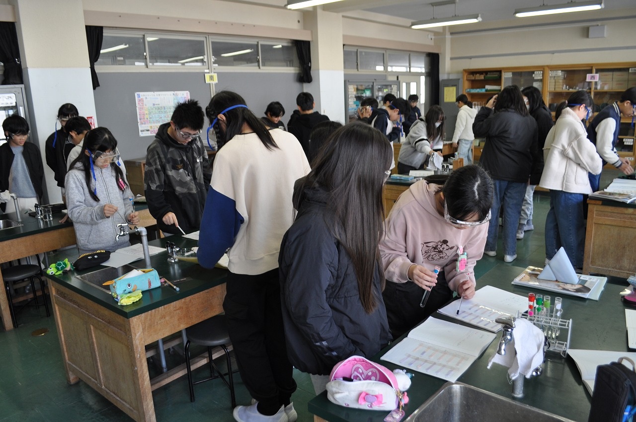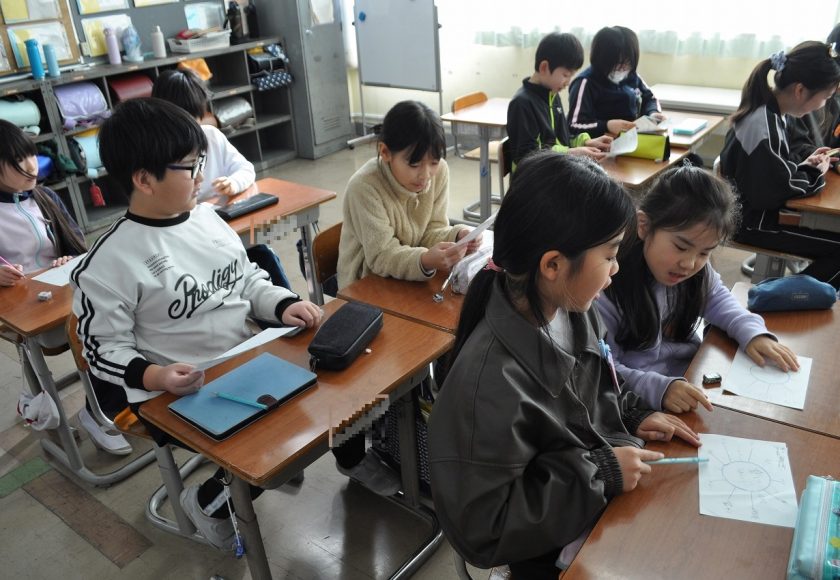 6年理科「水溶液の性質」。水溶液をリトマス紙を使って調べています。
