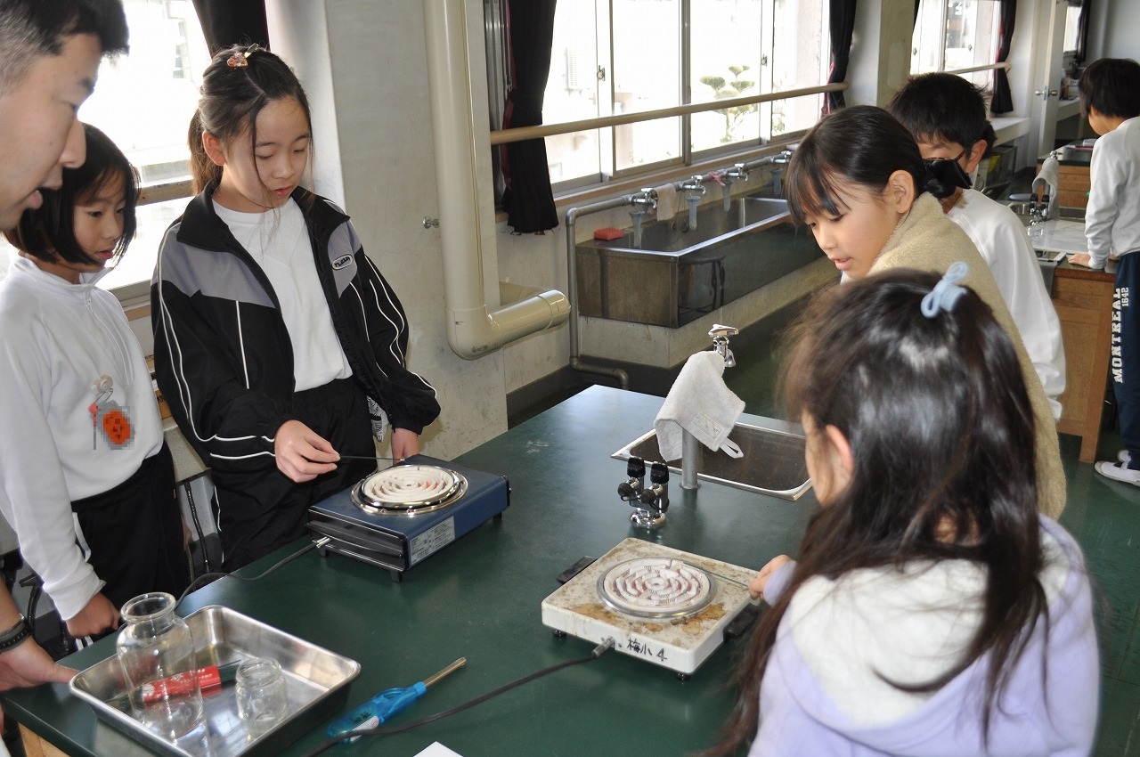 4年理科「もののあたたまり方」。空気のあたたまり方について実験計画を立て、調べています。電熱線の上に線香のけむりを近づけた時のようすを観察しています。