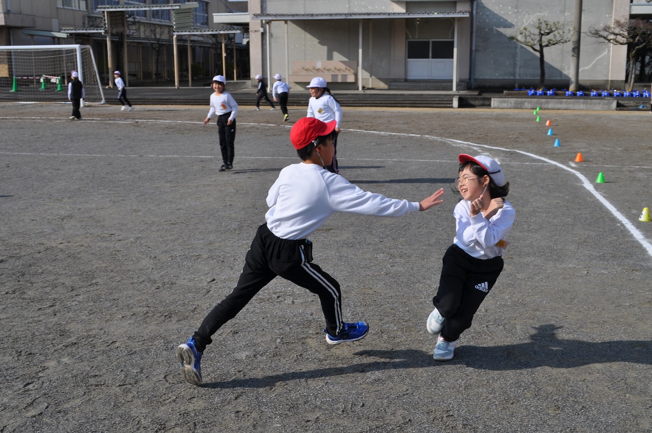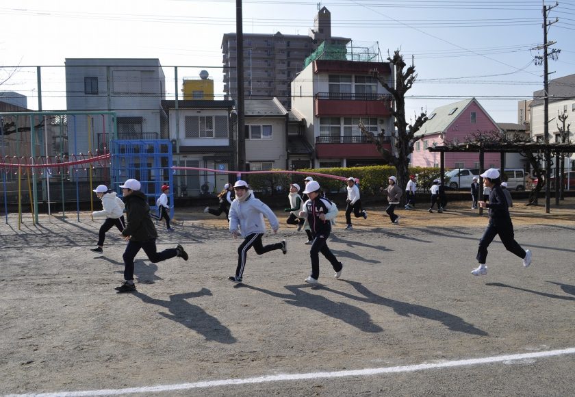 5年生の体育はペース走でした。午後の活動だったので、走ると薄着でも汗をかくくらいでした。実際走ってみて、自分の走るペースの目標を確かめました。