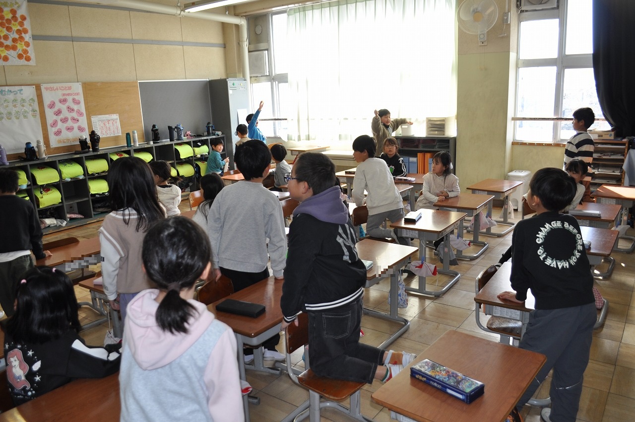 ハッピータイム、教室で宝探しをする1年生。