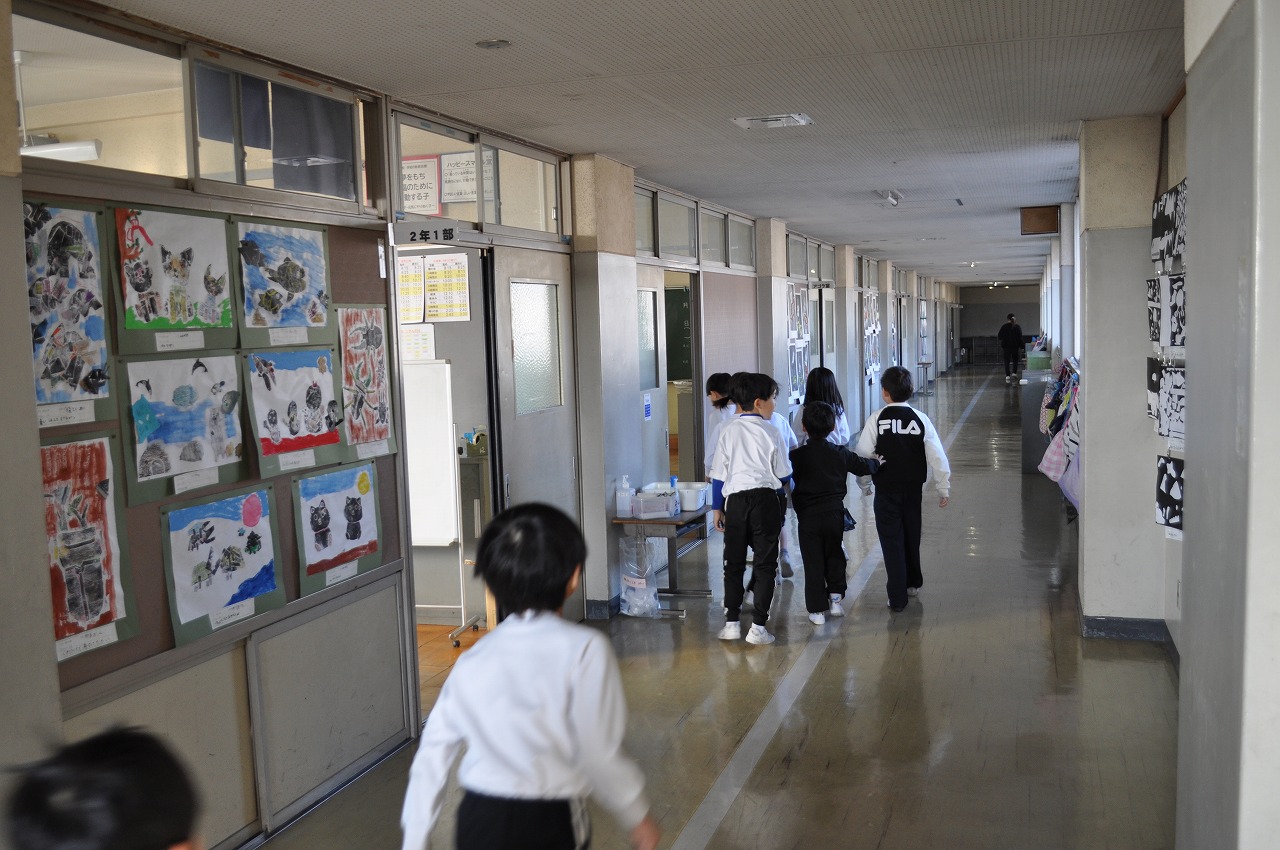 本校は2階以上が洪水および内水災害の避難場所となっています。より子どもたちの安全を確保することと、一般の緊急避難場所との一時的な区別ができるようにするために、全員が3階に避難しました。2階で生活している子どもたちは、3階の空き教室に移動しました。実際は警報発表等により、帰宅後に学校が避難所となる場合が多いと思われますが、万が一のことを考えて、日ごろから訓練を行い、実際に災害が発生した時の迅速かつ安全な対応につなげていきます。