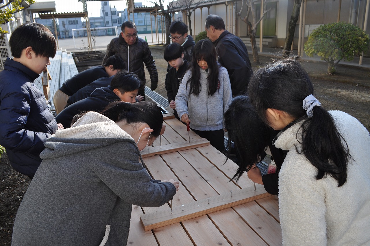 完成したベンチに防腐剤を添付して完成です。連合会長さんをはじめ、地域ボランティアの方が中心となって準備やベンチの製作が行われました。ありがとうございました。