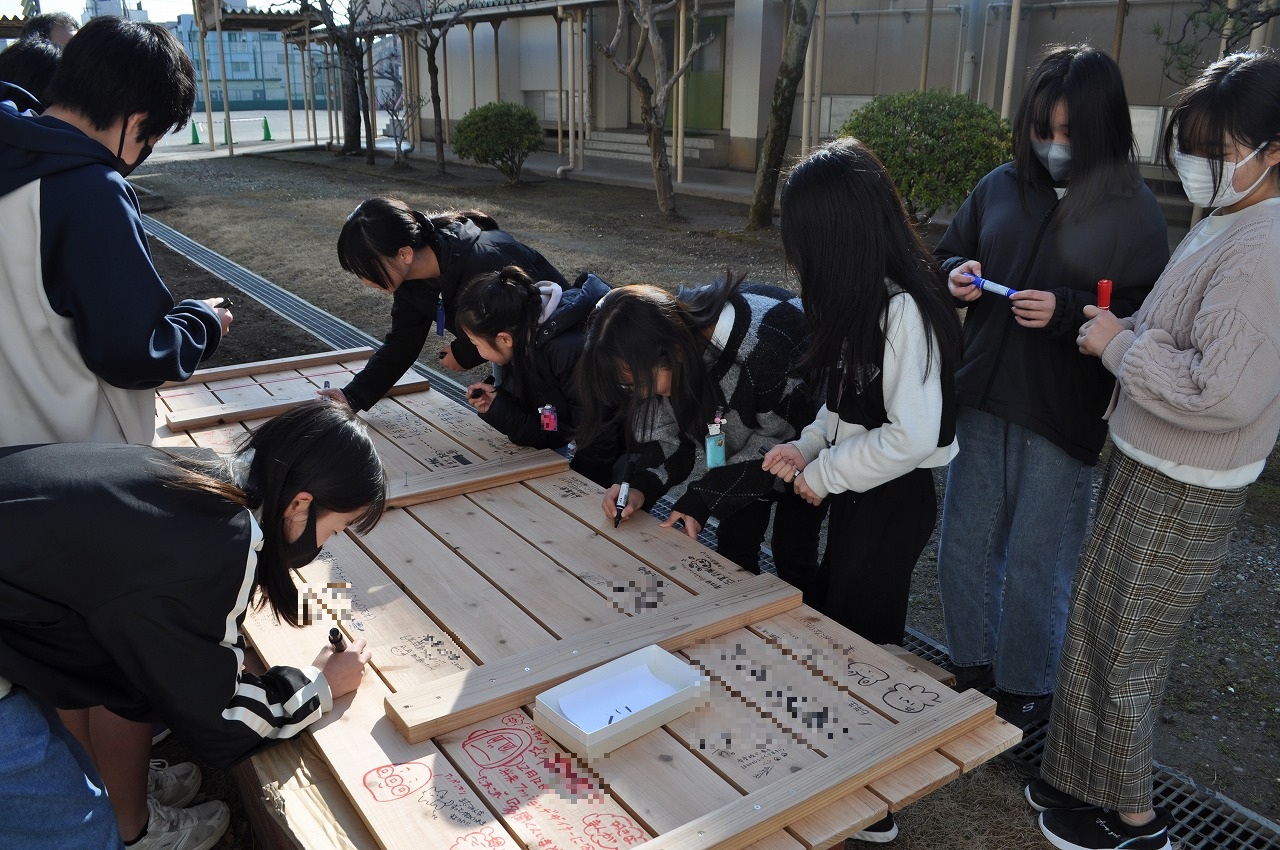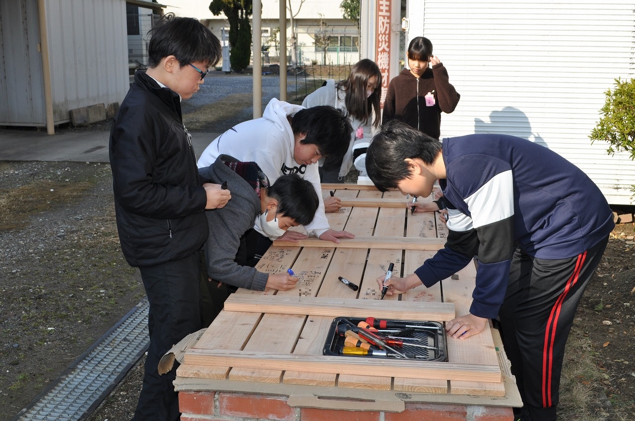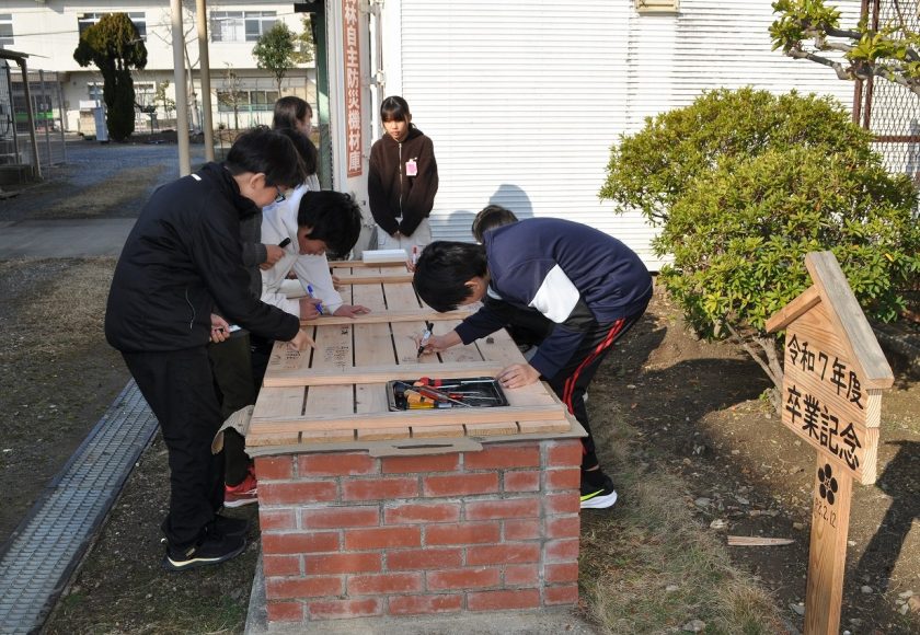 災害に関連し、本校の南舎と体育館の間には「かまどベンチ」と呼ばれる場所があります。この場所は学校が避難場所となった場合の炊き出し用のかまどとして活用できるようにしてあります。普段はかまどの上に板を敷いてベンチとして活用できるようにしていましたが、劣化が激しくなったため、この度地域の方が新調されました。前のかまどベンチに裏には平成20年代の卒業生のメッセージが書かれていて、二十歳の集いに集まったみなさんで見たそうです。新調したベンチの裏に、今年の卒業生がメッセージを残すことになりました。