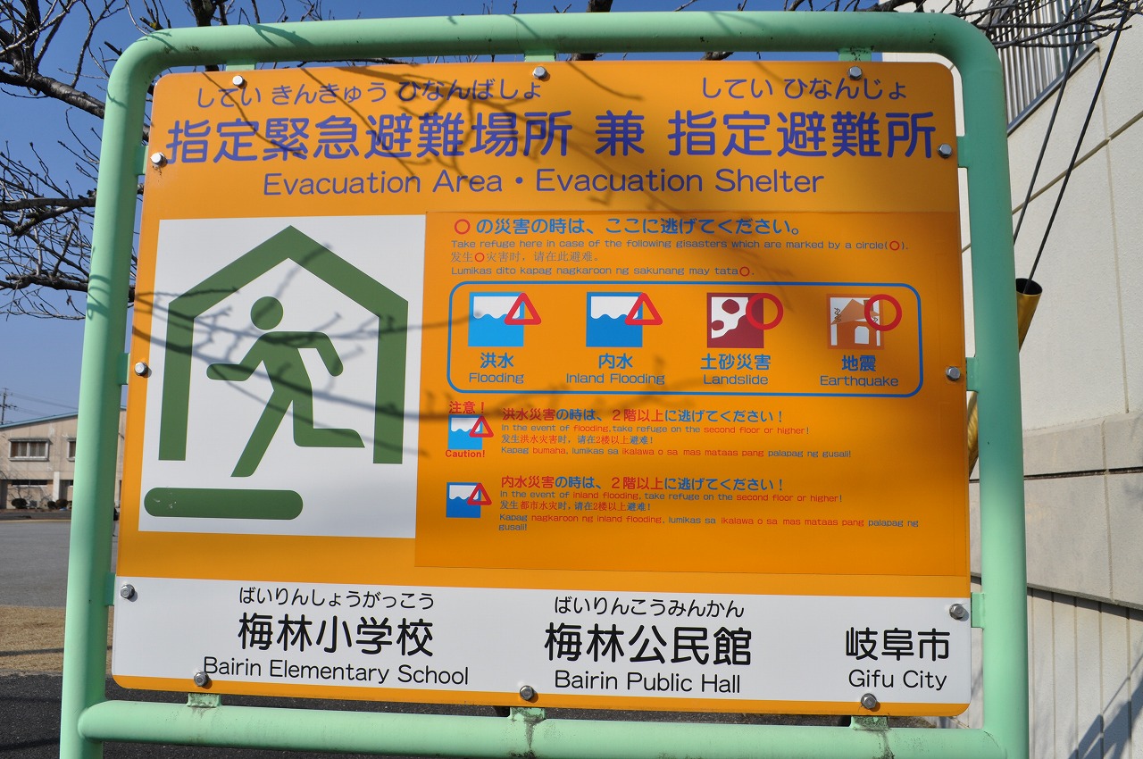 梅林小学校は「指定緊急避難場所」と「指定避難所」を兼ねた施設になっています。「指定緊急避難場所」は、災害が発生した際に、身を守るために一時的に避難する場所です。「指定避難所」は、災害発生後、自宅の損壊や、水害、がけ崩れ等の危険のため自宅で生活ができない被災者が、一定期間生活するための施設です。指定避難所の中でも、市立小学校は災害用の資機材を重点的に備蓄している施設として「指定拠点避難所」となっています。今日は、表示の災害の中でも、洪水(木曽川や長良川の氾濫)や内水(岩戸川の氾濫)災害が発生したことを想定した垂直避難訓練を行いました。