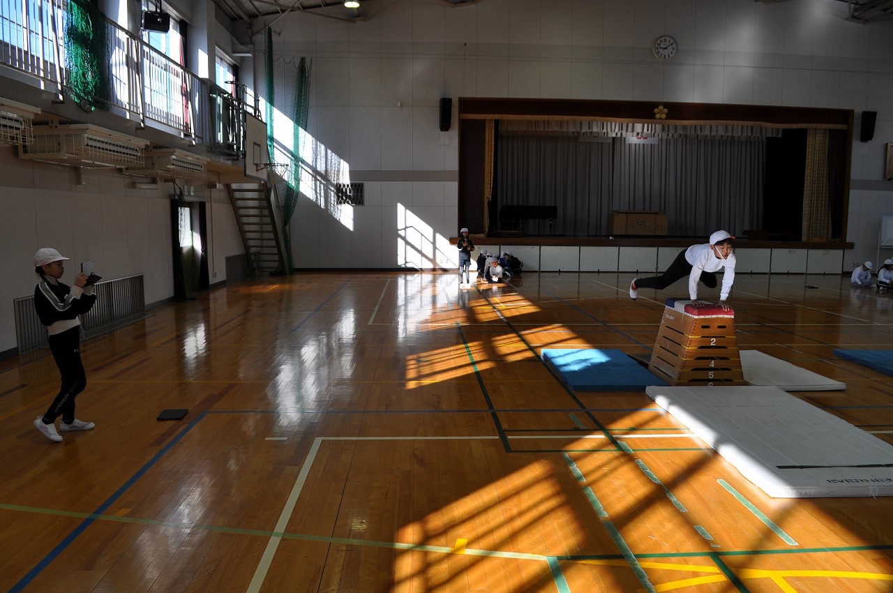 3年生体育「開脚跳び」。跳ぶ姿を動画に撮影してもらい、後から再生して振り返ります。
