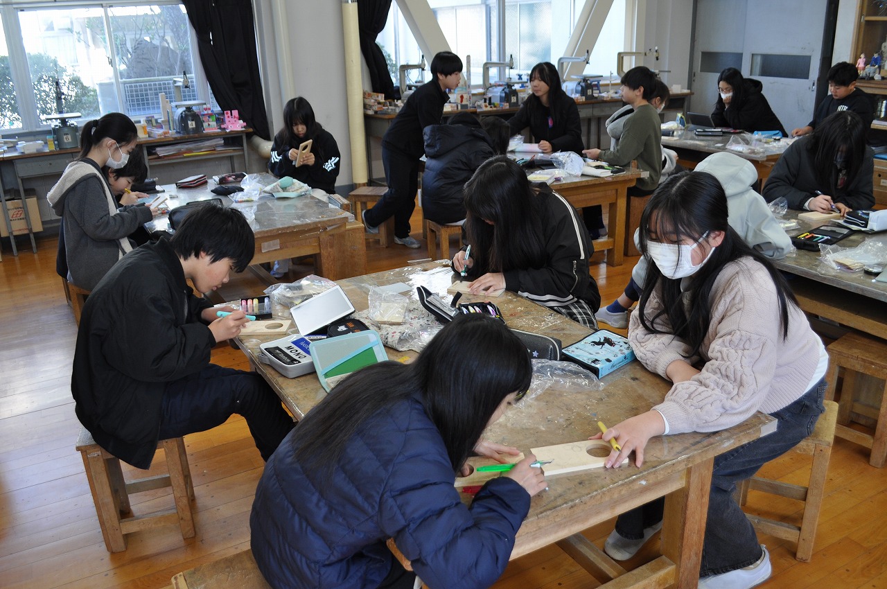 6年生図工。卒業制作で思い出を板に表し、彫刻刀で彫っています。