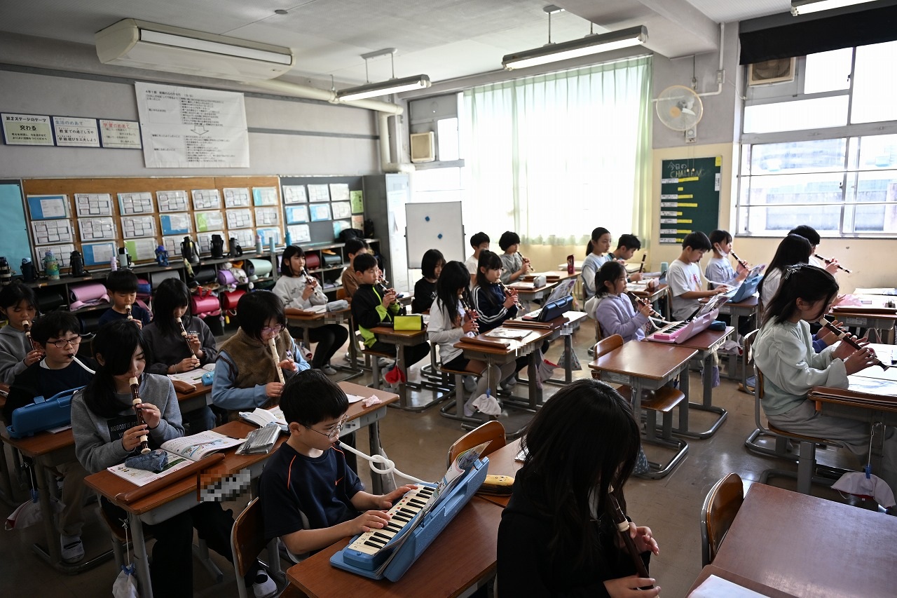 4年生は音楽でリコーダーと鍵盤ハーモニカの合奏をがんばっていました。これまで学習で何度も取り組んできたこともあり、だんだん伴奏のテンポが速くなっても、がんばってついてきていました。
