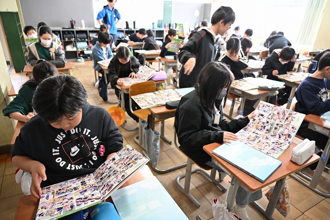6年生が卒業アルバムを受け取り、懐かしそうに読んでいました。今年のアルバムは、最初の2ページ見開きは自分の個人写真が掲載されていて、一人ずつ違ったものとなっています。