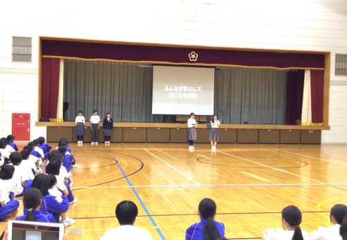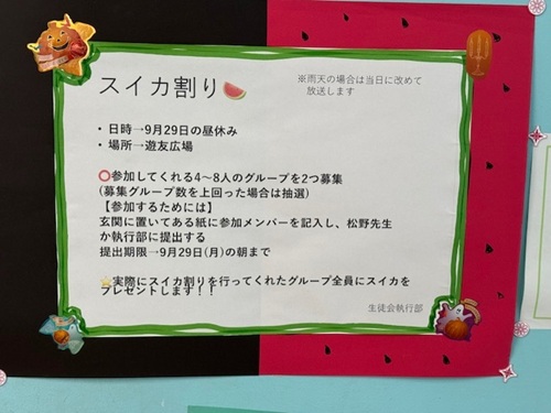 9月29日(月)の昼休みに、梅林中の農園で育ててきたスイカを使って、生徒会執行部が企画したスイカ割りを行いました。小ぶりのサイズのスイカが2個実ったので、そのスイカを使いました。チーム対抗戦で行うことになり、いくつかのチームがエントリーをしましたが、そのうちの2チームがスイカ割りを行いました。中庭でスイカ割りをする生徒は目隠しをして、新聞紙を丸めて作った棒をもち、チームの仲間の指示を頼りに行いました。中庭で行ったため、中庭でその様子を応援したり、クラスにいる子は教室の窓からその様子を見て笑い合ったりするなど、大いに盛り上がりながらスイカ割りを行うことができました。暑い夏の終わりに、心が温かくなり、ホッと一息つける時間になりました。