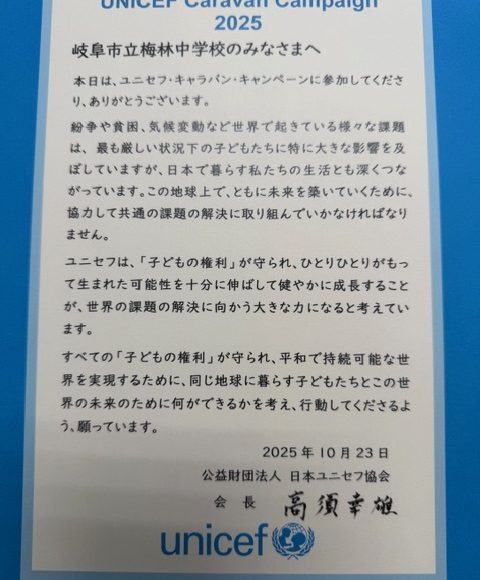 10月23日(木)に日本ユニセフ協会の東京事務所から、石尾 匠さん、山口 鮎美さん、そして岐阜県ユニセフ協会の方をお招きして、ユニセフ教室を行いました。ユニセフ教室では、世界で起こっている戦争や紛争、自然環境の変化によって、学校に行くことができずに命が脅かされている子どもたちの現状を学びました。また、子どもの権利条約について、確認することができました。お話だけではなく、13ℓほどの水が入る金属の水がめを運んだり、マラリアから身を守るために虫よけ剤が付いている蚊帳に入ったりする体験をすることができました。今回の教室を通して、同じ地球に暮らす子どもたちとこの世界の未来のために、何ができるかを考える貴重な機会となりました。ユニセフの皆さん、ありがとうございました.
