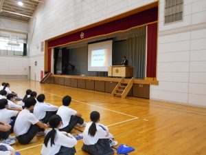 10月16日(木)の後期始業式の後に引き続き、「いじめを見逃さない日」の取組として、生徒会担当の伊藤先生、いじめ対策監の松野先生が次のような話をされました。