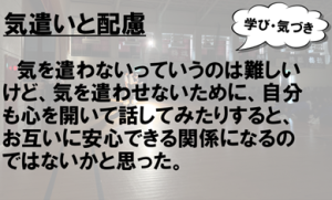 この話から半月が過ぎようとしていますが、もう一度先生方からの言葉が普段の生活に生かされているか、自分自身を見つめ直してほしいと思います。