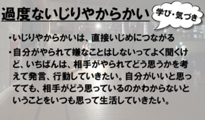 4月からの半年間を振り返ったときに気になることがあったので、後期はそのことを十分に意識して生活してほしいと思います。それは、「人の嫌がかることを言ってしまう」「からかってしまう」などの場面が見られたことです。ほんの軽い気持ちで言ったことでも、相手の心には長く残るということです。言葉や気持ちは目には見えないのですが、人の心を動かす大きな力をもっています。だからこそ、「この一言で相手はどう感じるかな」と立ち止まって考えることが大切です。(中略)「いじめられている人が変わるべき」とか「いじめられない努力をする」これらは、間違った捉え方であり、正すべき内容です。変わるべき、努力をするのはいじめを受ける人ではなく、いじめをする人、それを容認してしまう傍観者であることを皆さんには十分に理解してほしいです。