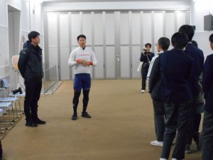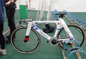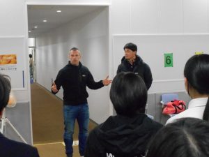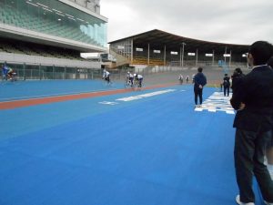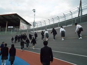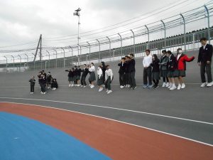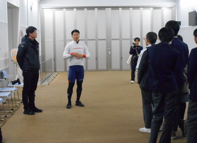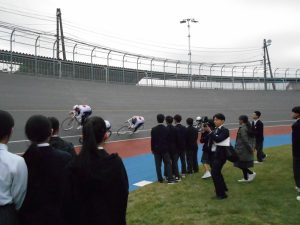 11月12日(水)の午後に、2-3が岐阜競輪場の施設見学に行きました。2-3は7月のキャリア・スクールで競輪選手の話を聞いたというつながりで、施設見学に行くことになりました。ちょうど、自転車競技の日本代表選手が合宿で岐阜競輪場を使用していたため、その様子も見学することができました。競輪場のトラックでカーブにあるバンクを歩かせてもらいましたが、かなりの急斜面で驚きました。さらには、実際に日本代表選手がトラックで練習をしていましたが、トップスピードのときにはものすごい速さで、思わず歓声や拍手が起こりました。その中には、長迫 吉拓選手もみえ、ゆっくり走っているときはこちらに手を振ってくれました。選手の中には自転車の値段が2,300万円するものに乗っており、そのカッコよさに見とれてしまいました。普段は関係者以外立ち入ることができない施設も見せていただき、驚きと感動の施設見学になりました。
