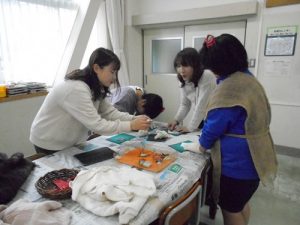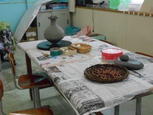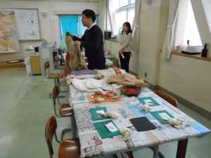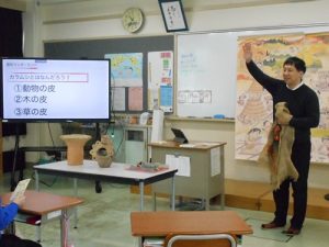 12月17日(木)にさわやかA組の社会の授業で、岐阜市歴史博物館の先生から、縄文時代や弥生時代の人々の暮らしについて学びました。現在のように、包丁などの金属がなかったため、いくつかの石を見せてもらい、何に使用していたのかクイズ形式で考える場面がありました。料理に使用する石や獣を狩るための石、装飾に使った石など、石の硬さや加工のしやすさで、いろいろな用途に使われていることがわかりました。体験学習では、土器に網の模様をつけたり、貝殻の模様をつけたりして縄文式土器をつくったり、どんぐりを石で砕いて中の実を取り出したり、包丁のような石で魚を描いた紙を切ったりしました。歴史博物館のいろいろな歴史遺産から、縄文時代や弥生時代のことについて、理解を深めることができた学習になりました。