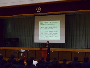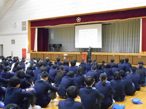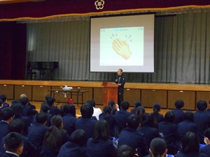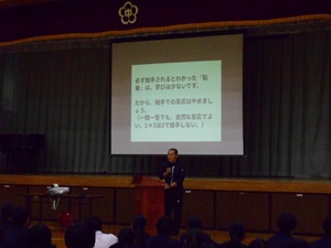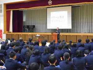 12月22日(月)の朝に、4ターム(1年間を4つの期間に分けた最終のターム)集会を行いました。最初に学習担当の岩西先生から、授業における「反応」と「挨拶」についての話がありました。「普段の授業で、仲間が発表した後に拍手が起こることがありました。その拍手をすることで、考えることが止まってしまうことがあります。授業は『正解で終わる』ものではなく、『考えを深めていく』ことが大切です。拍手ではなく、うなずき、表情、目線など、自然な反応をすることを心がけましょう。授業は、先生だけがつくるものではありません。みんなでつくるものです。正解だけを書く『消えないペン』ではなく、間違えても消して直せる『鉛筆』や、『それもいいね』と仲間の意見を支える『消しゴム』として、間違いを恐れずに意見を出していきましょう。意見が増えるほど、学びは深くなります。次に挨拶は、『気をつけ』という言葉を入れていくので、姿勢を正して気持ちを込めた挨拶を大切にしていきましょう。授業は、『考えること』『間違えること』『話を聞き合うこと』これらすべてが大切です。一人一人の姿勢がクラスの学びをつくっていきます。みんなで安心して意見が言える、学びが深まる授業をつくっていきましょう。」という話がありました。残りの3か月の授業で、これらのことを意識しながら、1年間の締めくくりとして「最高の授業づくり」をめざしていきましょう。