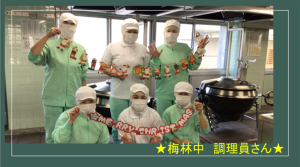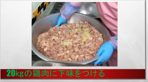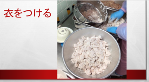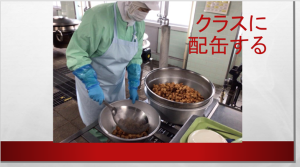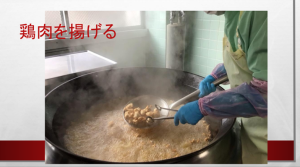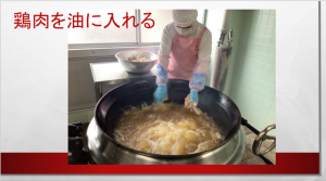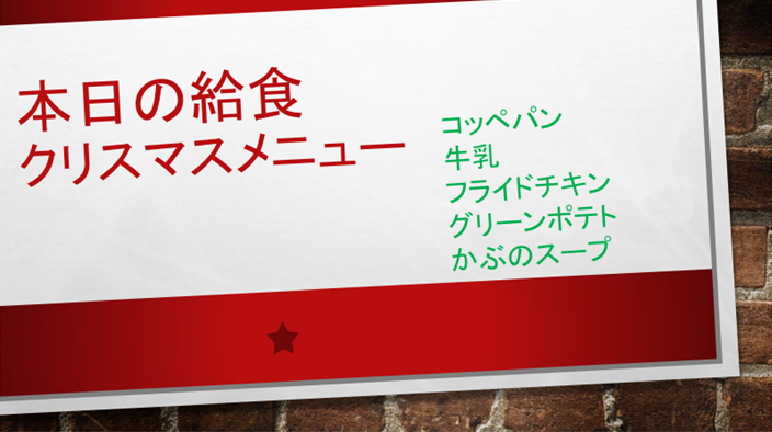 12月23日(火)の給食のメニューは、「クリスマスメニュー」であり、コッペパン、牛乳、フライドチキン、グリーンポテト、かぶのスープ、デザート(ショコラ)が出されました。お昼の放送で栄養職員の藤木先生から、クリスマスメニューの紹介と、その一品であるフライドチキンを調理員さんがつくる様子をプレゼンテーションで紹介しました。生徒の皆さんが少しでもおいしく食べられるように一生懸命つくっていただけたことが、プレゼンテーションを通してよくわかりました。これからも、毎日おいしく、そして安全に給食を作っていただける調理員さんに、感謝の気持ちを忘れないようにしましょう。