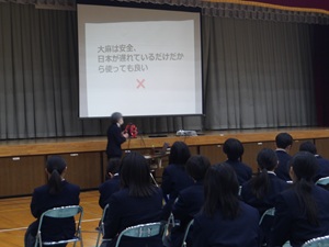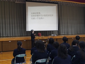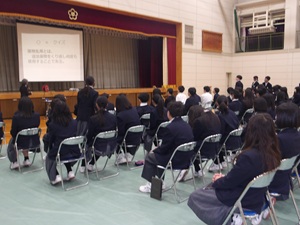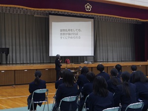 3月12日(木)に、1年生が薬物乱用防止教室を行いました。学校薬剤師の羽賀 早紀先生を講師としてお招きして、DVDを見たり、話を聞いたりしました。覚醒剤や大麻、危険ドラッグなどの特徴や体にどんな影響があるのかを知るとともに、このような違法薬物が名前を変えて私たちのまわりにSNSなどを通じて近づいていることを知りました。好奇心や欲望で薬物を求めてしまう人がいますが、「きっぱりと断ること」「薬物に関わらないこと」「愛する自分を大切にすること」について講話を通して学ぶことができました。講話が終わってから、講師の先生から「意見がたくさん出て、楽しく講話をすることができました。こういう雰囲気のよさが梅林中にはありますね」と、うれしい言葉をいただくことができました。