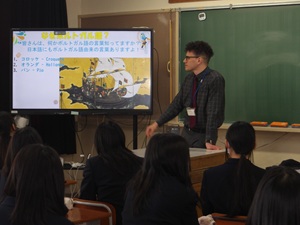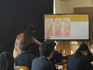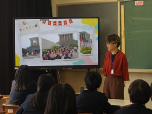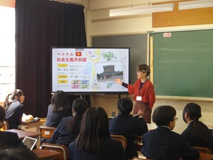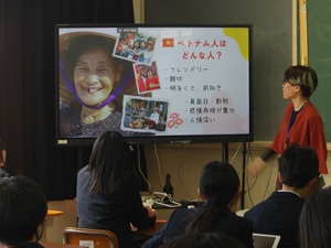 3月12日(木)に、ベトナムのヒエンさん、中国のキユウさん、ブラジルのグスタボさんの3名を講師として、1年生が国際交流の授業を行いました。ベトナムのヒエンさんは、食事や服装、あいさつなどのベトナムの国に紹介をしたり、クイズ形式で日本とベトナムのちがいを知ったりすることができました。中国のキュウさんは、中国の紹介をした後で、折り紙を使って中国の伝統的な飾り物をつくる体験をすることができました。ブラジルのグスタボさんは、ポルトガルやブラジルの歴史、地理、文化、生活する人々について、プレゼンを使って紹介しました。いろいろな国の特徴を知ることができ、国際理解を深めることができる貴重な授業を行うことができました。