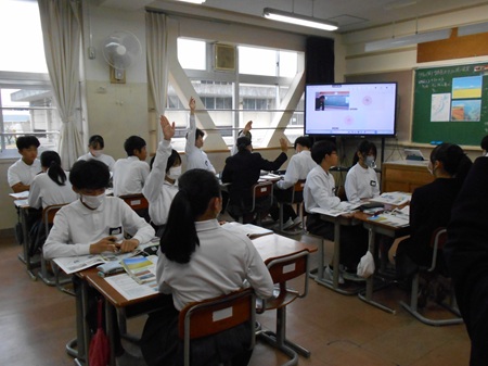 10月30日(木)の1-2の国語の授業では、「『言葉』をもつ鳥 シジュウカラ」の学習を生かした探究学習として、一人一人がアンケートをつくり、意見を集約し、グラフ化をして分析したことをレポートにまとめることを行っていました。参観したときには、その導入として、「あなたの学級は、楽しいですか?」という質問に対して、アンケートを集約した結果をもとに、どんなことがいえるか意見交換をしていました。そのときには、自由発言(指名なし発言)が行われ、文字通り担任の成山先生は指名をして発表させるのではなく、生徒自らが自分で発表しようと思い、自ら立ち上がって発表するものでした。勇気のいる行動ですが、これも「チャレンジ」だと思います。今回一番初めに立ち上がった子は、これまで決して発言が多くなかったのですが、今日は誰よりも早く発表できていました。自分から主体的に取り組む姿がすばらしいと思いました。これからの学習でどんなアンケートを作って、どんな分析をするのかレポートの作成を楽しみにしています。