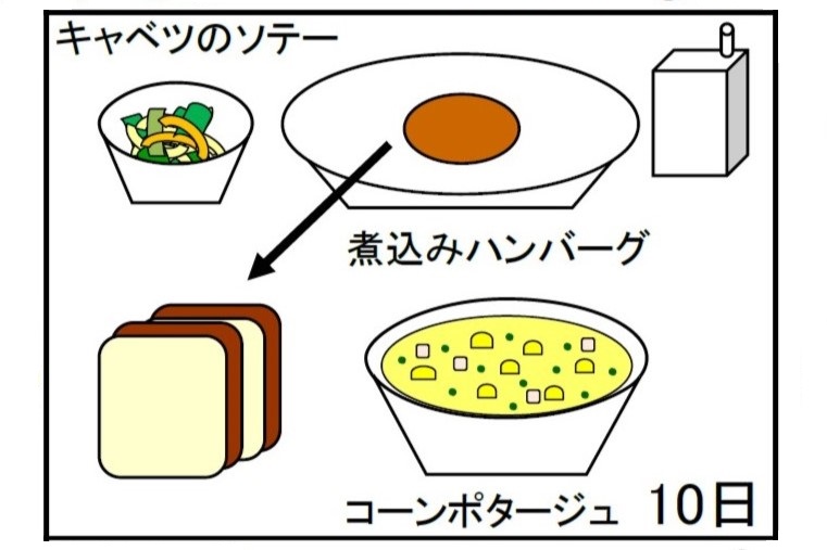 今日は食パンに煮込みハンバーグとキャベツのソテーをはさんでセルフサンドにして食べます。