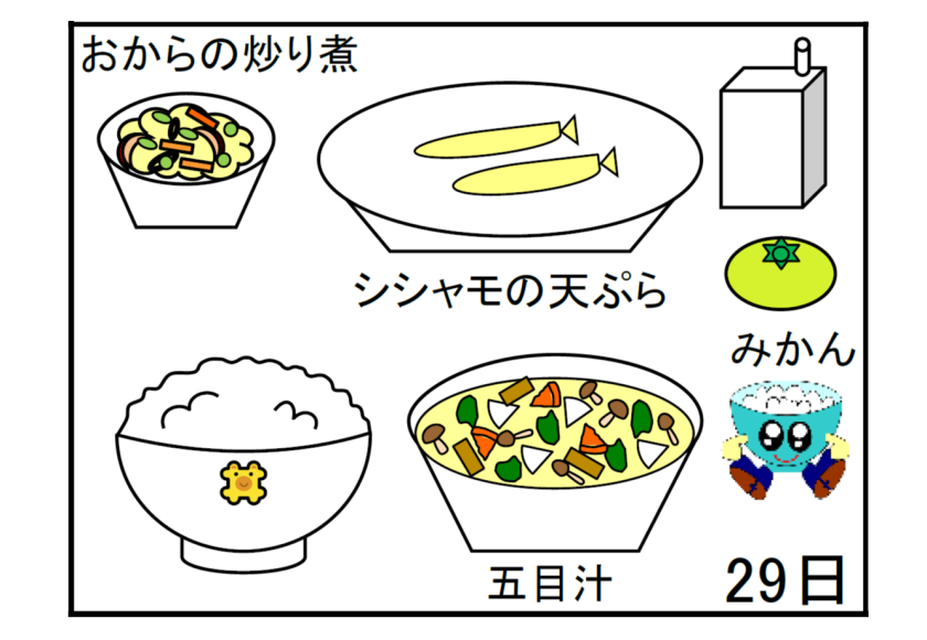 今日の給食はご飯に汁物、魚のおかず、煮物を組み合わせた和食の献立です。