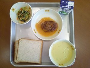 今日は食パンに煮込みハンバーグをはさんで食べるセルフサンドの献立です。