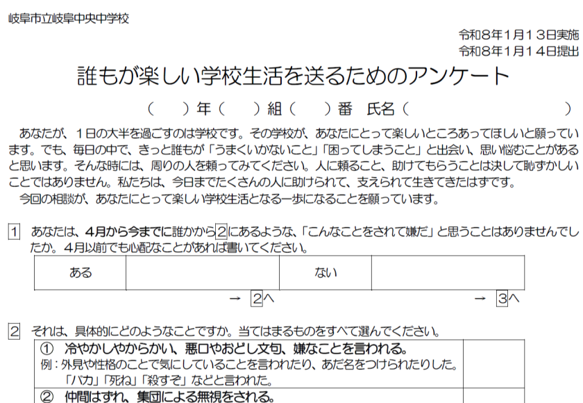 1月13日に、いじめアンケートを配付、1月14日に、いじめアンケートを回収しました。