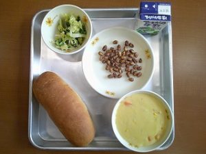 揚げた大豆はかみごたえがあり、よくかんで食べてほしいメニューです。