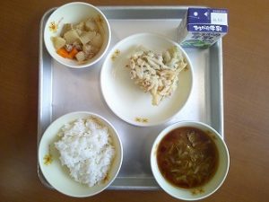 今日のかき揚げには、ごぼう、たまねぎ、くきわかめ、大豆が入っています。
