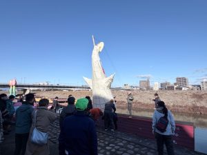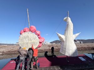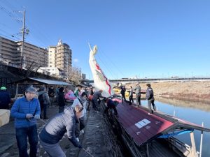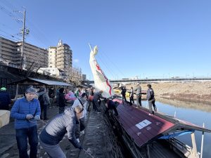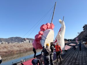 岐阜小の『10月行灯』は、昨日ホテルパークに搬入され、12/22(月)朝、地域の皆さんや関係者のご協力で鵜飼観覧舟に取り付けられました。