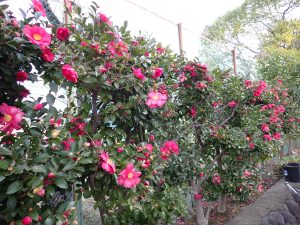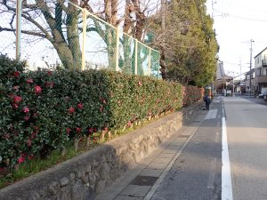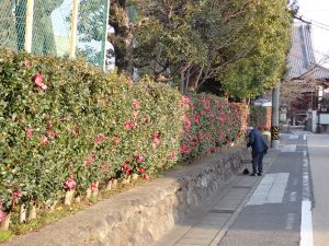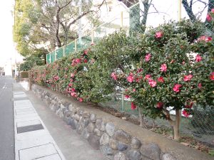 現在、学校の垣根に植えられたサザンカが満開を迎えています。毎朝、ピンク色の花びらが地面に舞い落ち、緑の葉とのコントラストがとても美しい光景をつくり出しています。