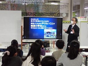2/6(金)、岐阜市の水川教育長さんが来校され、6年生に向けて「今日が楽しく、明日も来たくなる未来の学校とは?」をテーマに特別授業をしてくださいました。