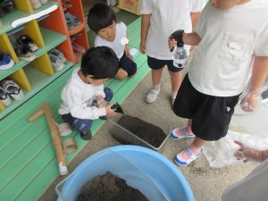 カブトムシのマットを変えようと運んでいると、「何してるの?」「やりたい!」と、集まってきてくれました。