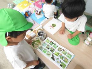 帰りの会で、子どもたちが捕まえた虫について、「何を食べるんだろう?」「どんなところだと生きていられるんだろう。」と子どもに投げかけています。