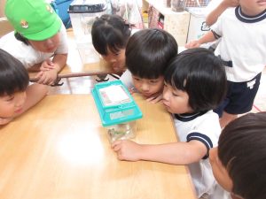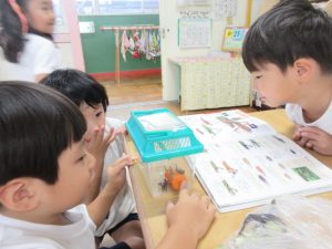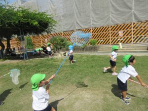 自分の虫を捕まえたい子、なつめ組で飼っているカマキリの餌を獲りたい子、見比べたり、喧嘩するか見てみたり、どんな様子になるか知りたくて、同じ飼育ケースに入れてみたい子、様々です。