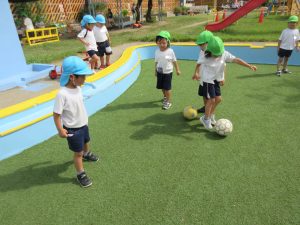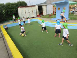↓プールの人工芝で、サッカー遊びも楽しんでいます。