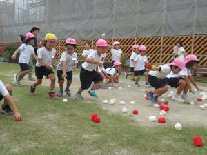 最近のたいよう組の子どもたちの様子を見ていると、これまであまり興味がなく取り組んでこなかったようなことに対しても、「ぼくもやってみたい」と心が動き出しています。簡単には上達しないような運動遊びにも挑戦しています。その過程のなかで、自分の得意なこと・苦手なことを感じたり、友達と自分を比べて、相手のことを羨ましく思ったりする姿があります。それでも、一緒に取り組む友達や教師に励まされたり、認められたりしながら、少しずつ上達していく実感をもち、またさらに「もっとやってみよう」というパワーに変えている気がします。