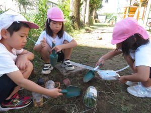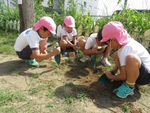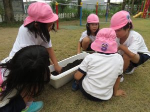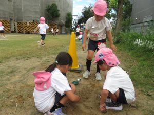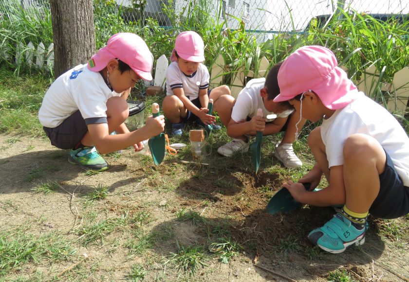 「虫はいないね・・」とがっかりする中で、A君が「前って罠を土の中に埋めてたよね・・」と思い出しました。「そうだった!埋めてた。」と今度は穴掘りが始まりました。