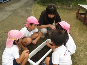 ダイコンとカブの種比べをしたり、園庭のギンナンを拾ったりするなかで、種にも興味が出てきました。そこで「なぞのたね①・②・③・④」と称して、4種類の種を園庭のプランターに撒くことにしました。ニンジン、芽キャベツ、ブロッコリー、ラディッシュが育つ予定です。