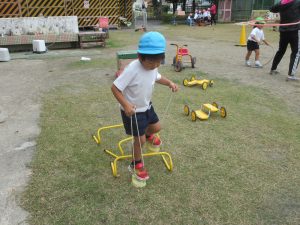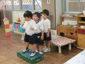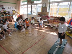 たいよう組さんが親子ふれあいフェスティバルでやっていた、ポックリやスッテプバランスに興味を持ったようでチャレンジする姿が見られました。見たことで、興味をもちやってみたい気持ちが少しでてきたのかなと思いました。