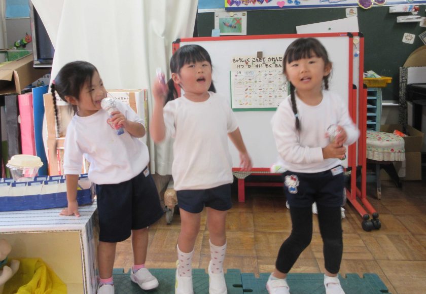 きっかけは、先週のことです。A君に「先生(魔女の宅急便)歌って〜」と、突然言われノリノリで歌ったら、「僕も歌いたい!私も歌いたい〜」と集まってきました。そこで、巧技台をステージにしてカラオケのようなコンサートが始まりました。