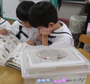 最近バッタを触れるようになったA君。友達のB君と一緒に1つの飼育ケースを持ち、図鑑でどのバッタに似ているか特徴を見比べながら調べたり、