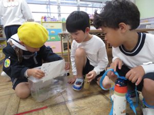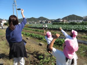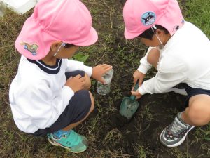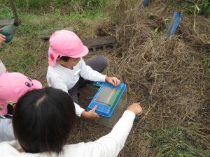 その後はやはり、新しい種類の生き物は捕まらず、子どもたちと相談した結果、幼稚園の園庭よりも虫やカエルが居そうな畑に仕掛けることにしました。