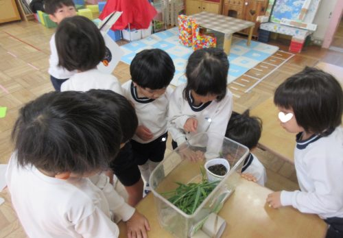 Cちゃんが「足にトゲトゲがある!刺されないの?」と初めてコオロギに触れました。「なんかツルツルしてるね。目がかわいい!」「穴がある。これは鼻?」「虫に鼻はあるの?」・・怖々触っていたのに、一度触れられると、嬉しくて愛着も湧きます。