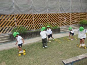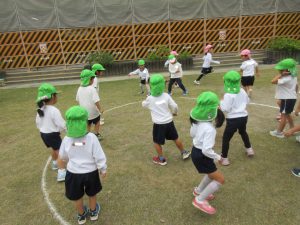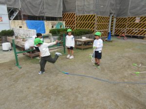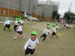 縄跳び等の遊びを通して、気持ちの良い気候の中、友達と一緒に体を動かす気持ち良さを感じています。