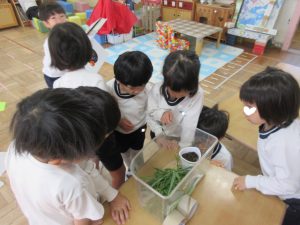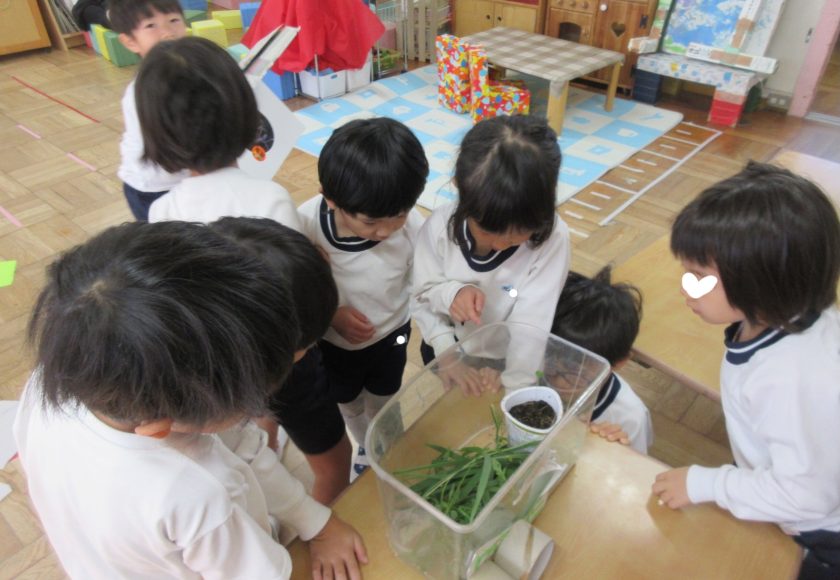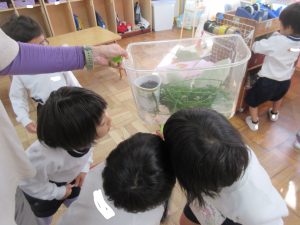 カマキリの餌となるバッタがめっきり捕れなくなり、そうなると調べてもなかなか餌をどうすると良いか分からず、試しに魚肉ソーセージを揺らしてあげてみたのですが…食べませんでした。小さなシジミチョウを捕まえて、「カマキリの餌にする」と言って、入れてくれる子もいます。とても虫が好きなので、シジミチョウを飼いたいという気持ちもあると思うのですが、そこでカマキリのためにあげるという気持ちが、虫を飼育することで育まれた、愛着とか大切にする心なのだろうと思います。